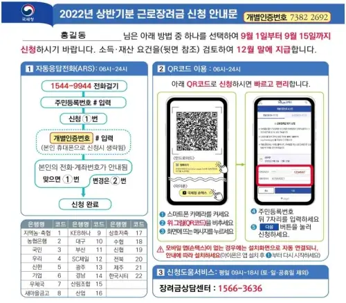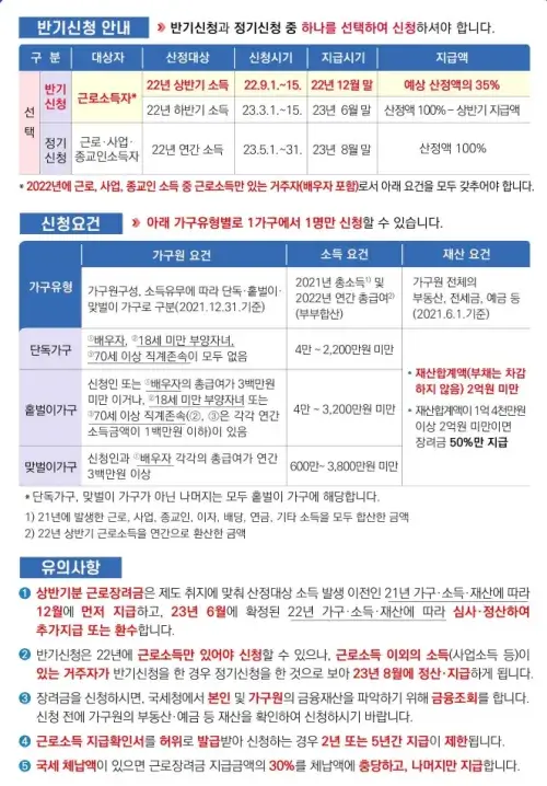 신청 기간은 9월 1일~9월 15일이며, 연간 근로장려금 예상 산정액의 35%를 12월 말에 지급합니다. 만약 9월 15일까지 신청하지 못하였어도 내년 22년 하반기분 신청기간 (23년 3월 1일~3월 15일) 또는 22년 정기 신청기간 (23년 5월 1일~5월 31일)에 신청할 수 있습니다.